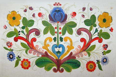 A distinctive style of decorative painting known as rosemaling (shown below) originated in Norway, featuring colorful floral patterns painted on various surfaces such as furniture, woodenware, and household items. Traditional Scandinavian textiles often feature intricate embroidery and weaving techniques, with patterns that include floral and geometric designs, commonly found in clothing, tapestries, and other fabric-based items.